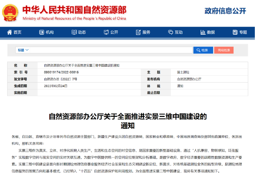 2022年2月24日,自然資源部辦公廳印發(fā)了《關(guān)于全面推進(jìn)實(shí)景三維中國(guó)建設(shè)的通知》。《通知》指出,實(shí)景三維作為真實(shí)、立體、時(shí)序化反映人類生產(chǎn)、生活和生態(tài)空間的時(shí)空信息,是國(guó)家重要的新型基礎(chǔ)設(shè)施,是數(shù)字政府、數(shù)字經(jīng)濟(jì)重要的戰(zhàn)略性數(shù)據(jù)資源和生產(chǎn)要素。實(shí)景三維中國(guó)建設(shè)是面向新時(shí)期測(cè)繪地理信息事業(yè)服務(wù)經(jīng)濟(jì)社會(huì)發(fā)展和生態(tài)文明建設(shè)新定位、新需求,對(duì)傳統(tǒng)基礎(chǔ)測(cè)繪業(yè)務(wù)的轉(zhuǎn)型升級(jí),是測(cè)繪地理信息服務(wù)的發(fā)展方向和基本模式,已經(jīng)納入“十四五”自然資源保護(hù)和利用規(guī)劃。