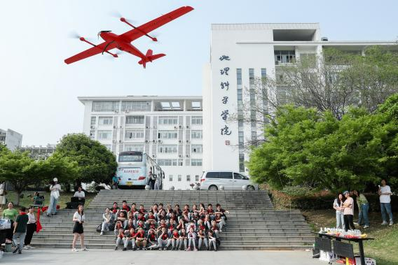 接著,飛燕遙感的雷存越主任與航攝員們?yōu)橥瑢W(xué)們進(jìn)行了無人機(jī)航拍展示。在地科院前廣場(chǎng),飛燕遙感雷存越主任向同學(xué)們講解了無人機(jī)基礎(chǔ)知識(shí),包括無人機(jī)的基本結(jié)構(gòu)、分類以及在地理方面的應(yīng)用等,為同學(xué)們揭開了無人機(jī)的神秘面紗。在航攝員們的操作下,一架架形態(tài)各異的無人機(jī)依次騰空而起,表演了空中懸停、急速升空等操作,精彩的表演贏得了同學(xué)們陣陣驚嘆和熱烈掌聲。