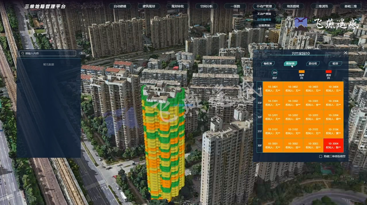 基于城市實景三維模型和相關(guān)國土信息數(shù)據(jù),提供二三維數(shù)據(jù)一體化展示、國土資源一張圖管理功能,支持三維宗地、三維樓幢、三維戶室的多層級精細化地籍管理。