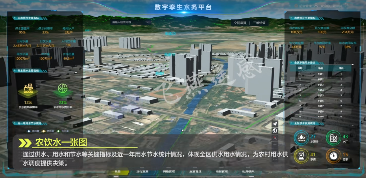 集成數(shù)字孿生技術(shù)、三維可視化技術(shù),通過建模渲染建立水務(wù)設(shè)施的結(jié)構(gòu)形狀和位置關(guān)系,實現(xiàn)物理對象的數(shù)字化表達。打通水務(wù)管理中各業(yè)務(wù)系統(tǒng)的數(shù)據(jù)孤島,實現(xiàn)水務(wù)工程的三維展示、全過程實時監(jiān)測、故障預(yù)警等,協(xié)助管理者一目了然地掌握業(yè)務(wù)趨勢,獲取數(shù)據(jù)使用價值,完成高效率管理、運營和決策。