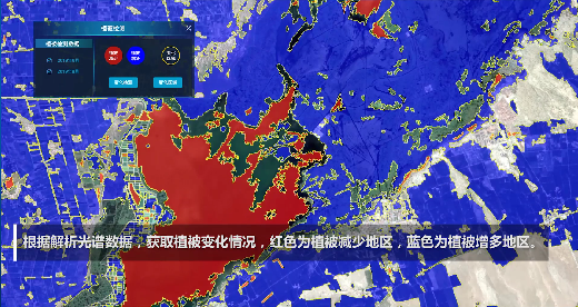 通過對不同時期遙感影像的植被情況進行分析、比對,通過NDVI(歸一化植被指數(shù))得出時間段內(nèi)的植被覆蓋的變化情況,并在底圖上進行可視化處理,紅色部分為植被減少,藍色部分植被增多。通過植被情況從側(cè)面觀察掌握污染情況。