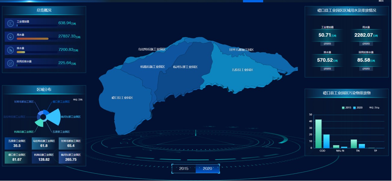 對重點區(qū)域排工業(yè)增加值、用水量、排水量、回用后排水量等數(shù)據(jù)作監(jiān)測統(tǒng)計,可以通過并將這些數(shù)值在各工業(yè)區(qū)的分布情況以餅狀圖的形式展現(xiàn),對重點區(qū)域的排污情況精確掌握,便于制定相應(yīng)管理策略。