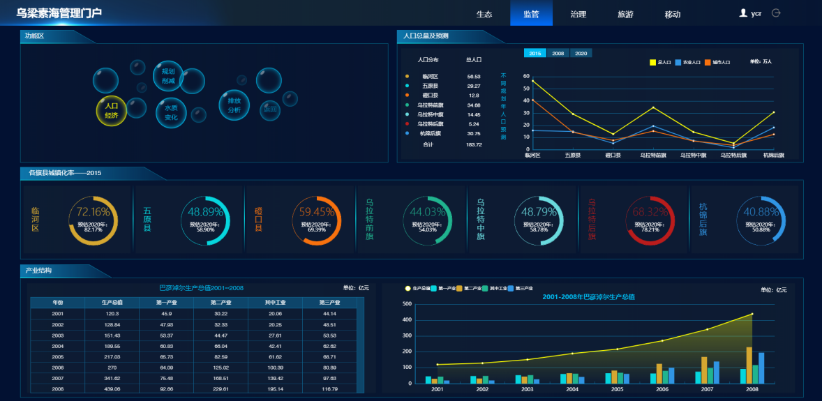 通過數(shù)據(jù)統(tǒng)計表格的形式,從人口經(jīng)濟、規(guī)劃削減、水質(zhì)變化、排放分析等方面,從水質(zhì)變化的根本處著手,與人口經(jīng)濟、宏觀調(diào)控等社會因素結(jié)合,對水質(zhì)情況進行深度的監(jiān)控管理。