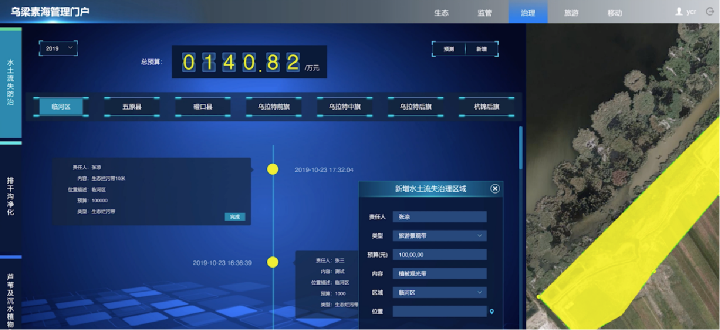 新增了水土流失防治、蘆葦以及沉水植物收割、排干溝凈化等方面,了解整年度水土流失工程防治及完成情況,對每個生態(tài)環(huán)保項目的負責人、經(jīng)費預算以及區(qū)域面積等信息進行詳細的統(tǒng)計展示。