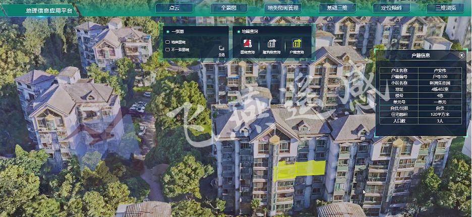 通過建筑物關(guān)鍵詞定位到建筑物位置并可以顯示建筑物屬性信息,在瀏覽屬性信息的同時(shí)可以多維度全方位觀察建筑物情況和周邊環(huán)境。
