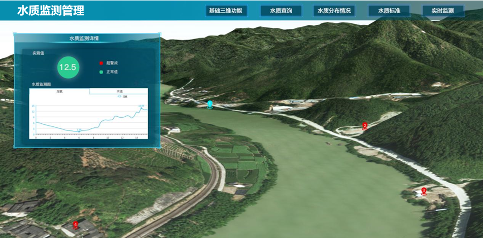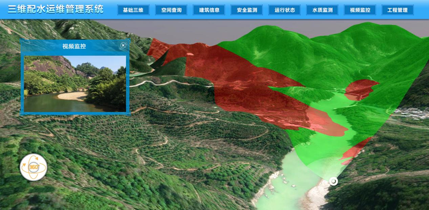 在系統(tǒng)中引入BIM模型,通過三維引擎仿真渲染后,實時直觀地以三維場景展示配水運維工程,并將實時獲取的各類運行信息在三維場景中結合局部三維模型直觀展示,具有配水運維工程空間查詢、建筑信息查詢、安全監(jiān)測、運行狀態(tài)監(jiān)測、水質(zhì)監(jiān)測、視頻監(jiān)控和工程管理等功能。