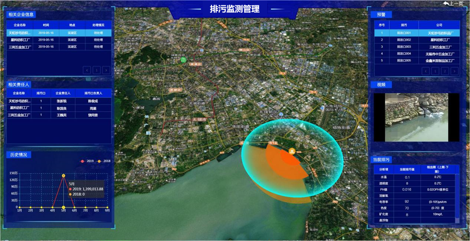 結合物聯(lián)網(wǎng)、網(wǎng)絡通信、傳感控制等信息科技手段,對各路管網(wǎng)污水排放、運行、處理等進行全程動態(tài)管控,統(tǒng)計排污總量、排污口等信息,并展示各區(qū)域內(nèi)排污治理情況。通過對污染源、管網(wǎng)、泵站、處理廠的水質(zhì)水量進行監(jiān)控,實現(xiàn)排污預警預報功能。