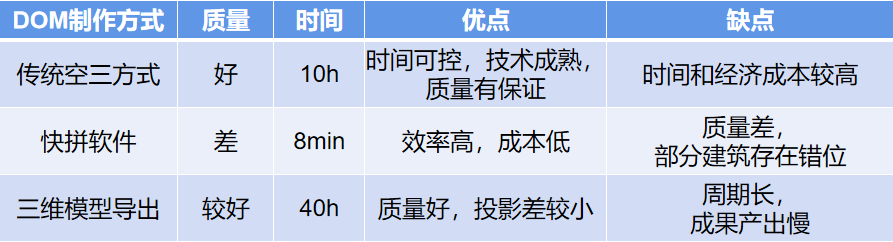從三種方式制作的正射影像可以看出,質(zhì)量方面?zhèn)鹘y(tǒng)空三方式制作的正射影像和通過三維模型導(dǎo)出的正射影像精度較好,快拼影像質(zhì)量要差一些,尤其是高層建筑投影差明顯,甚至?xí)霈F(xiàn)錯位現(xiàn)象。三種方式制作正射影像的優(yōu)缺點如表所示。