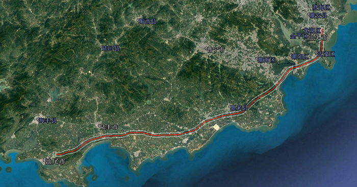 汕汕高速鐵路是廣東省重點工程,也是國家“八縱八橫”沿海高鐵通道的重要組成部分,由汕頭站至汕尾站,經汕頭市(龍湖區(qū)、濠江區(qū)、潮陽區(qū)、潮南區(qū))、揭陽市(大南海石化工業(yè)區(qū)、惠來縣)、汕尾市(陸豐市、海豐縣、東涌鎮(zhèn)),終于廈深鐵路汕尾站。正線全長162.750千米,全線設7座車站。